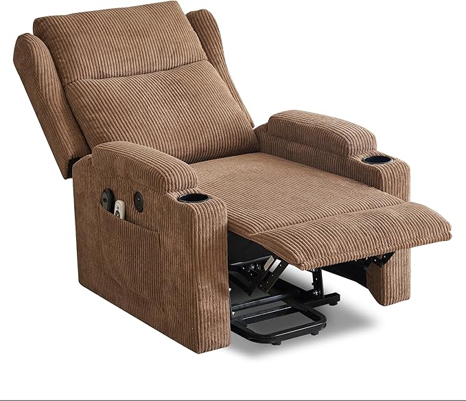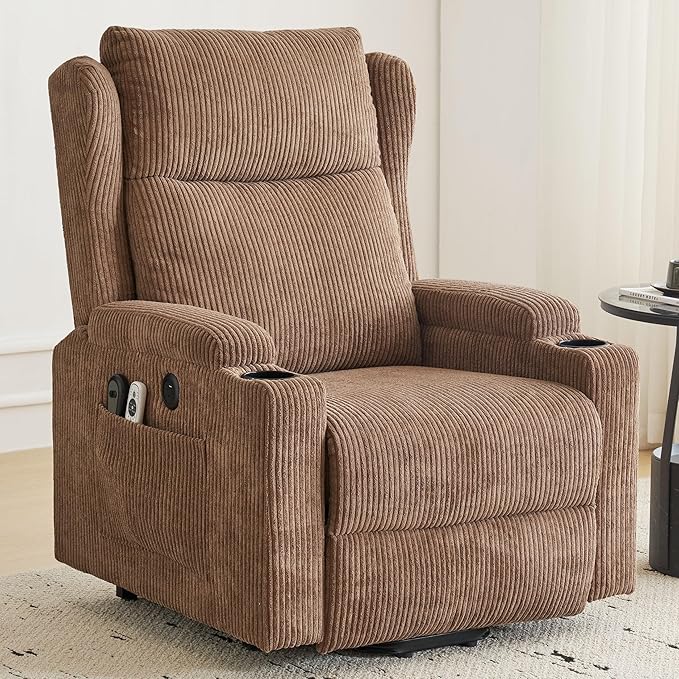 Lift Recliner Chair for Adults with Massage and Heating, Power Lift Recliner Chairs for Elderly, Corduroy Fabric Reclining Chair with USB &Type-C Port, Cup Holders, L6111 (Brown)