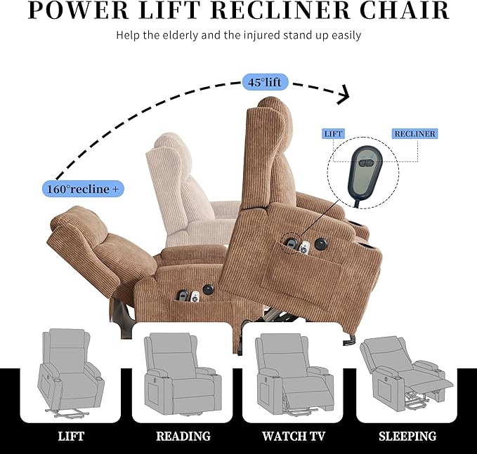 - 【Power Lift Recliner】: Our lift chairs are designed for rehabilitation patients such as the elderly and disabled. Just press a button on the remote control and the chair can be raised, lowered or tilted (160°) smoothly and gently, making it easier for people with limited mobility. This premium chair is engineered to help reduce the load on your back, waist, and knees and provides ample space and stability to provide comfort and support for individuals seeking a spacious and comfortable seat.
