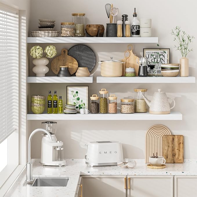 - Perfect Wall Decor: Handcrafted from premium 1.5" thick wood, our wood floating shelves boast a unique wood grain that infuses your space with timeless charm. Perfectly suited for any modern, traditional, rustic, or farmhouse decor, this shelf elevates the ambiance of your home and kitchen. With 4 colors and 4 sizes, you can creatively arrange your storage space with your style.