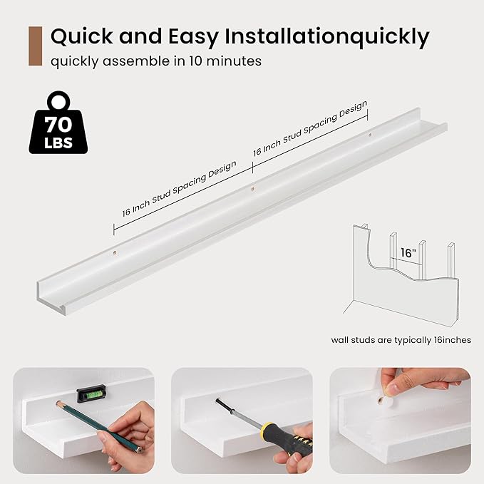 - 3.5" Floating Picture Ledge: Anti-Slip Narrow Design-3.5" ultra-narrow depth holds frames/plants without sliding, even on angled walls. Stud-Mounted Stability-16" pre-drilled holes match standard studs (hardware incl.) for wobble-free install. Clutter-Free Aesthetic-Clean lines blend with farmhouse/Scandinavian decor, focusing on your treasures