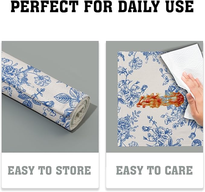 - Material Size: Our blue floral placemats are made of linen, which does not fade easily and is printed on both sides in bright colours. These placemats measure 12x18 inches, and are big enough to hold your plate. They can be reused