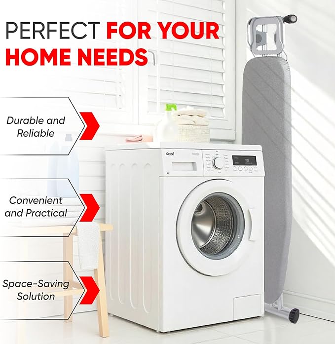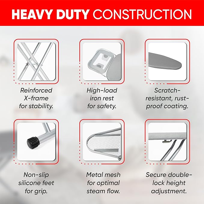 - Durable & Heat-Safe: This heavy-duty ironing board features a heat-resistant cover and a sturdy steel frame, delivering smooth, long-lasting results on any fabric
