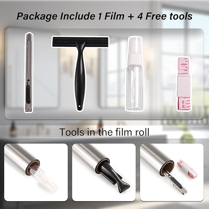 - Extra Gift Tool Kits: Each roll of this window privacy film comes with all the tools you need to install: spray bottle, utility knife, squeegee and measure tape to save money and time and make installation easier. The tools are in the paper tube, please tap tube to get tools out