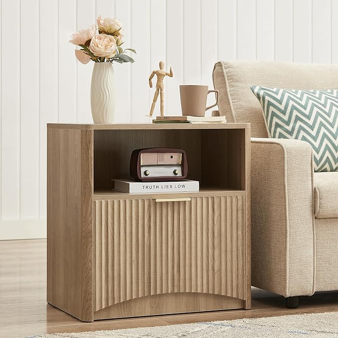 Fluted Nightstand, Natural Oak Bedside Table with Drawer and Storage, Wood End Table Mid Century Modern, Large Night Stand for Bedroom