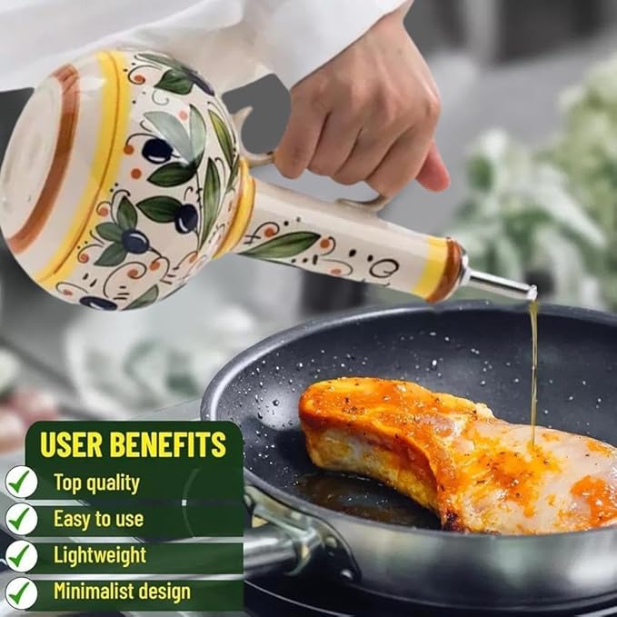 - PREMIUM QUALITY MATERIALS: each pottery olive oil dispenser is made of smooth ceramic, handcrafted and hand-painted into the flavor bottles to protect your olive oil from UV rays and maintain freshness olive oil bottle; ceramic oil dispenser;