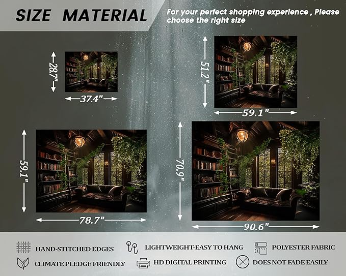 - SIZE AND HANGING: This bookshelf tapestry comes in many sizes,suitable for various walls and spaces. Contains 3 metal-free pushpins and 3 metal clips to help you easily install or remove.