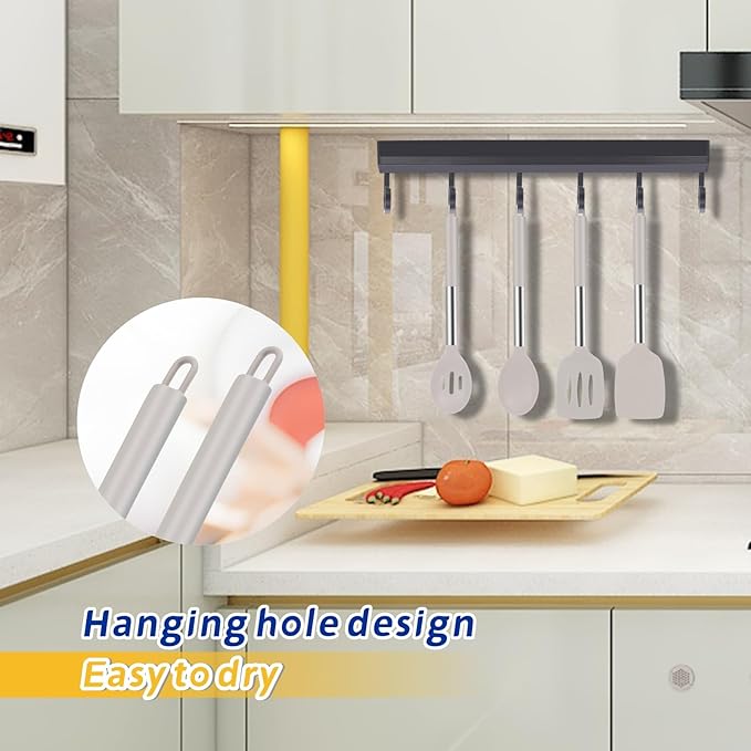 - The set includes: 13.7-inch slotted shovel, 13.7-inch solid shovel, 13.4-inch slotted spoon, 13.4-inch solid spoon and a 7.9-inch non-adhesive hook storage rack for multiple style items perfect for creating delicious food in the kitchen