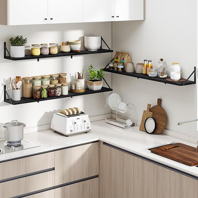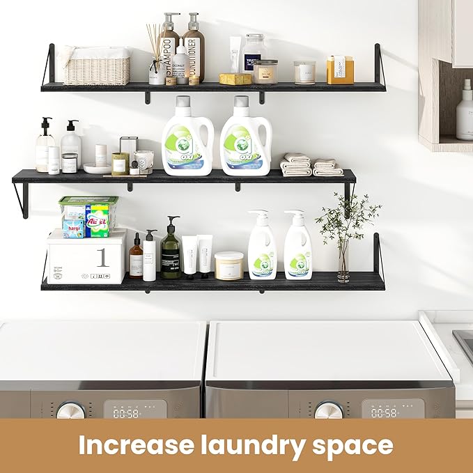 Heimlove 48 Inch Large Floating Bookshelves Set of 3,Black Wall Mounted Bookshelves,Heavy Duty Wooden Shelves for Living Room,Bedroom,Kitchen,Laundry Room Storage & Decor