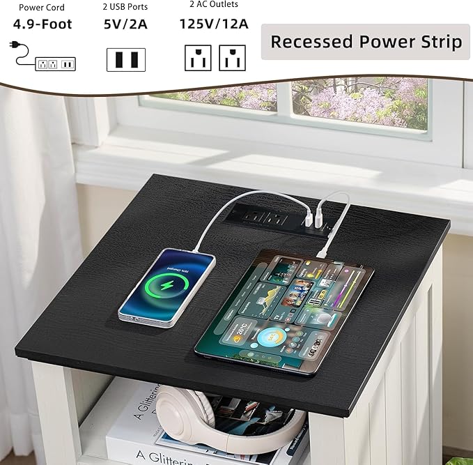 - End Table with charging station : The side table with storage is equipped with 2 standard AC sockets and 2 USB ports. This tall nightstand provides great convenience when you use electronic devices, keeping your charging devices within reach. A 2.3-inch round hole is designed on the back to facilitate the arrangement of socket power cables and charging cables, making the desktop more tidy.