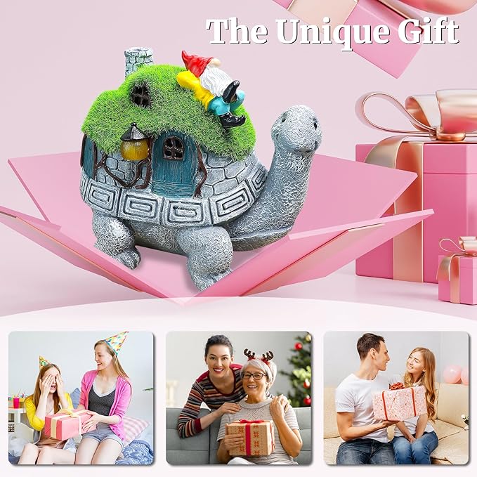 - The Turtle Decor Cute: A charming turtle house solar light, featuring a luminous design, harmonizes with lush lawns and little gnome, transforming into a warm, delightful highlight at night, infusing gardens with playfulness and vitality. As a solar-powered garden decor, this cute turtle carried the gnome on his back, decorating gardens, patios, porches, and water features with creativity and charm.