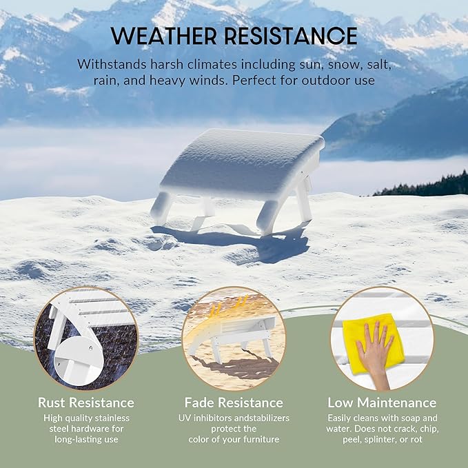 - All Weather Resistant: This Adirondack foot rest are made of HDPE plastic, its weather resistant and UV fade resistant material can withstand in various enviromental pressure and not easy to dent, crack , peel or rot as wood.