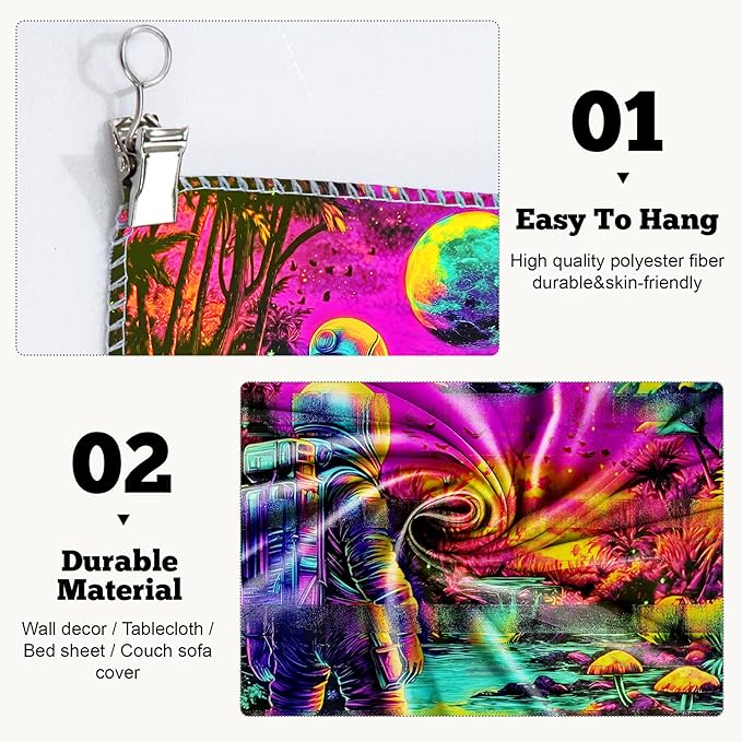 - Versatile Tapestry - With its durable materials and unique design, this blacklight tapestry can serve as a wall hanging tapestry, indie room tapestry, curtain tapestry, dorm room tapestry, ceiling tapestry, bedroom tapestry, glow-in-the-dark artwork or even a picnic blanket.