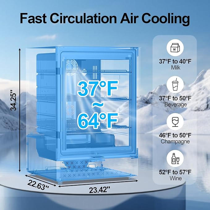 - 360° CIRCULATING AIR COOLING: Equipped with a powerful compressor cooling system and energy-efficient technology, this beverage cooler delivers strong, fast, and stable cooling performance, with a temperature range of 37° F - 64° F (1 - 16° C). It keeps your beverage at a constant temperature while quickly and reliably cooling your drinks. Additionally, it minimizes vibrations and noise, with an operational noise as low as 40 decibels.