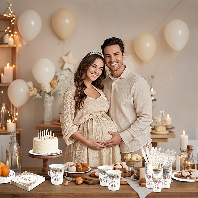 - 【Boho Neutral baby shower decorations】- Baby shower plates and cups and napkins sets include 20 9 inch baby shower plates, 20 7-inch boho plates, 20 baby shower cups, 20 baby shower napkins, 20 sets of plastic utensils (forks, spoons, knives), 140 pieces in total. This is a great boho baby in bloom baby shower decorations.