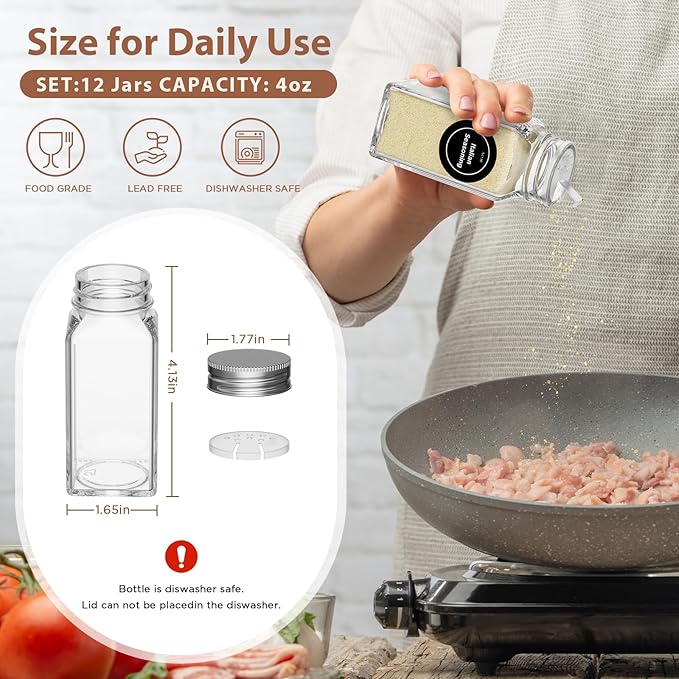 - 【Complete Spice Rack with Spice Jars Set】: This set of spice jars contains: 2 pack magnetic spice rack, 12 x 4oz glass spice jars with 5 sheets pre-printed labels and 1sheet blank label, 1 white pen , 1 silicone folding funnel (for refilling). All necessary accessories, in one box, no need to purchase separately. This set of seasoning containers with labels is the best choice for your kitchen.