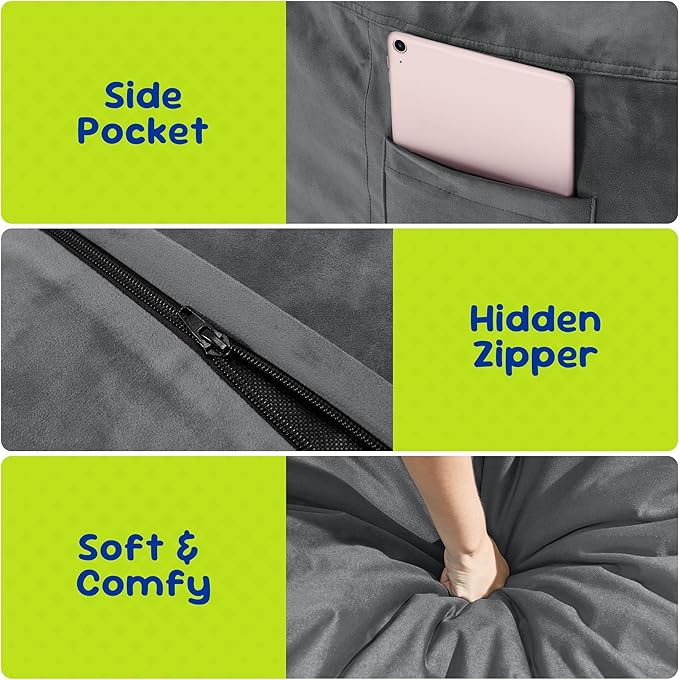 - Thoughtful Details: The bean bag chair comes with a carrying handle, making it easy for your little one to move it from room to room. Moreover, the small bean bag chair features a side pocket where your litte one can store their own belongings.