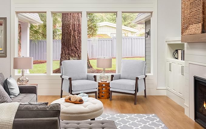 - Please Your Eyes - Designed in a unique mid-century modern style, the curved armrests provide a unique and stylish look, while the solid wood frame and linen fabric add a modern touch. With a sleek and modern design that incorporates retro elements, this accent chair will add a touch of sophistication to any room