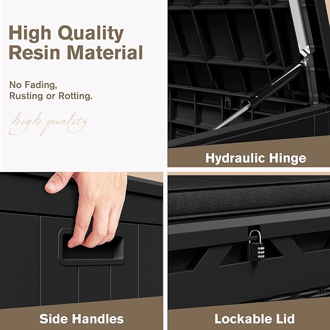 - High Quality Resin Material: Crafted from sturdy, long-lasting materials, this deck box is built to protect your belongings from dust, dirt, and moisture. The reinforced base ensures that it can support your items without collapsing or warping