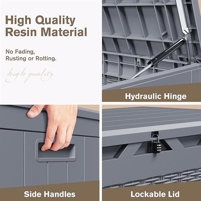 - High Quality Resin Material: Crafted from sturdy, long-lasting materials, this deck box is built to protect your belongings from dust, dirt, and moisture. The reinforced base ensures that it can support your items without collapsing or warping