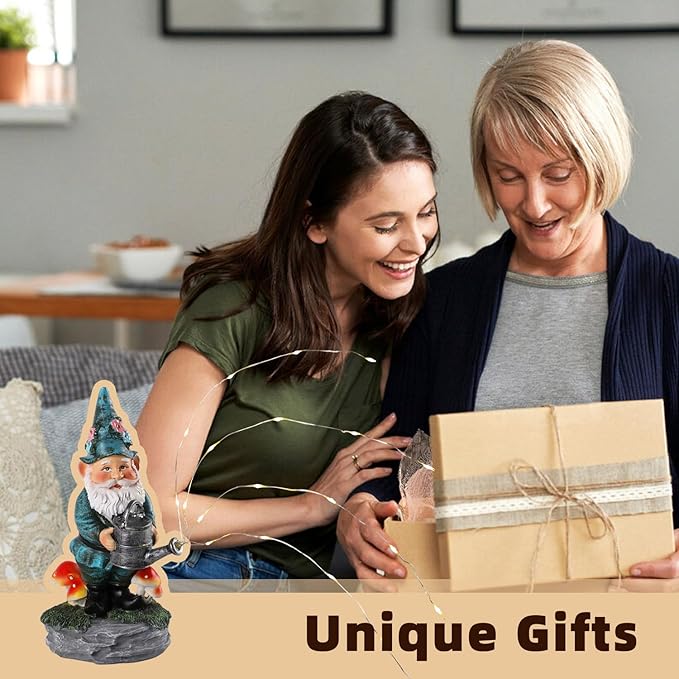 - Solar Gnome Garden Statue: A gnome standing on the grass sprinkling water,with a few brightly coloured mushrooms growing beside his feet,cute and full of fun,is a unique garden decoration,and a funny gift for children,garden lovers,and women like moms,grandmas,wives,girlfriends,bringing warmth and joy to them.