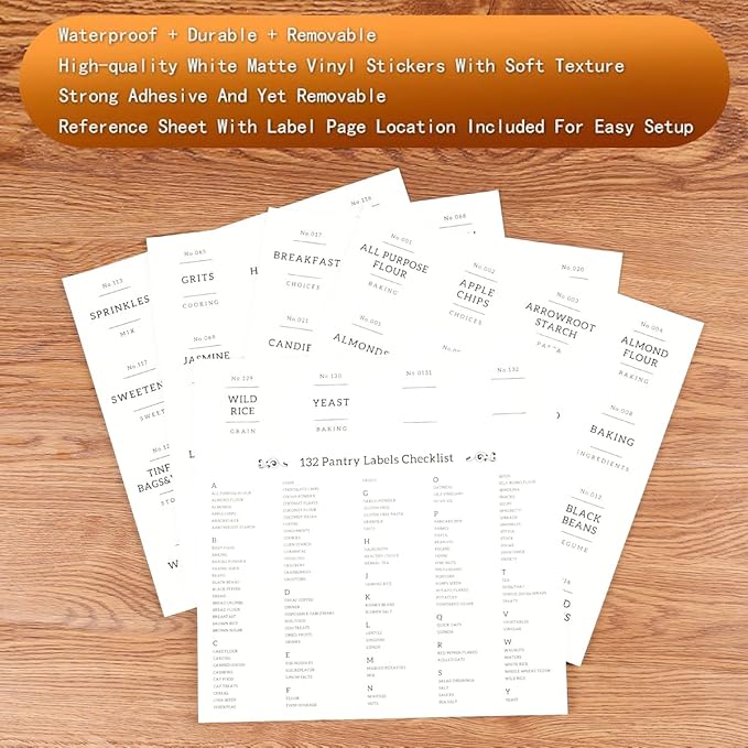 - 【PERFECT PANTRY LABELS】132 Kitchen pantry labels for kitchen storage containers to keep your food fresh and pantry tidy. Minimalist labels are black text on white food labels stickers suitable for all flour containers with lids airtight. Pantry decal organization labels are preprinted on premium waterproof vinyl stickers that won't tear or peel off but can easily be removed.