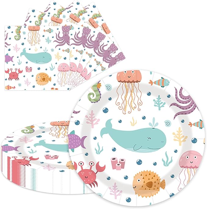 - Instant Party Atmosphere:Create cohesive ocean decor effortlessly—these party paper plates and napkins coordinate with tablecloths, cups, and birthday party banners.