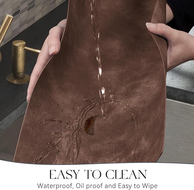 - HASSLE-FREE CLEANING: Our faux leather placemats are designed to be 100% waterproof to better protect the table from grease and grime compared to woven and fabric placemats. If the placemats get stained with sauce or food residue, simply wipe with a cloth or rinse with water.
