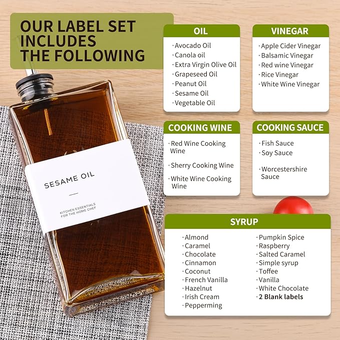 - 【Modern Kitchen Essential】: Minimalism Inspired Cooking Oil Dispenser for Kitchen. This Set Includes Three High-quality 17 Oz (500 Ml) Glass kitchen Oil Dispensers, three spouts, a funnel, a make-pen and a 32 Label Set.