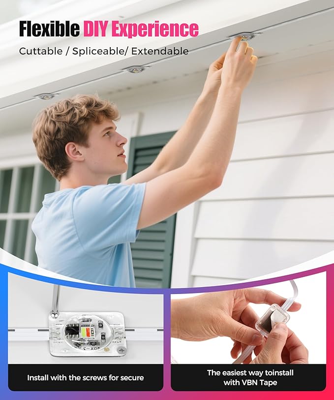 - ๐๐๐ ๐๐จ๐ฅ๐จ๐ซ๐ฌ + ๐๐ฒ๐ง๐๐ฆ๐ข๐ ๐๐๐๐๐๐ญ๐ฌ๏ผInstantly switch between 16 million RGB+IC colors! Pre-installed Christmas themes turn outdoor Christmas lights into holiday masterpieces. Adjust Warm White/Cool White (280 lumens, outperforms 99% of similar items) for a cozy evening or an energetic party - all in one light!