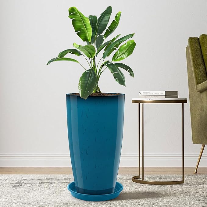 Tall Flower Pot Indoor - Outdoor Plant Pot - Turquoise Glossy Planter - Elegant Stone Imitation - 12" Diameter 21" Tall with Drainage Holes and Saucer