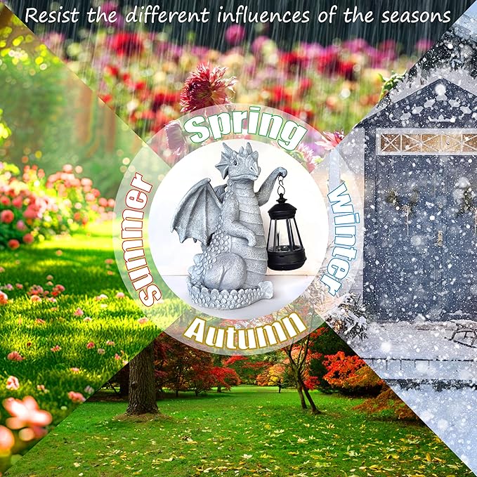 - 【Product Design】This dragon statue of ours this statue with solar lanten, beautifully crafted, the product has a wealth of detail, is the perfect gift, I believe that the person who receives the gift will love it.For lawn outdoor garden decorations, yard decorations, flower beds. Adding a bit of mystery to the garden, this dragon statue measures 9.1X7.5X10.2 inches, Made from high-quality resin, this statue is designed to withstand outdoor elements, including rain, snow, and sun.