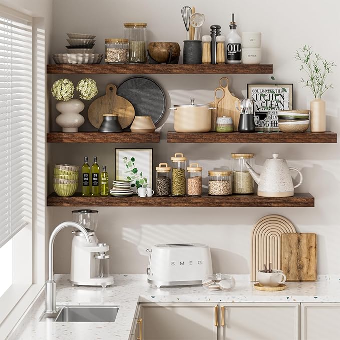 - Perfect Wall Decor: Handcrafted from premium 1.5" thick wood, our wood floating shelves boast a unique wood grain that infuses your space with timeless charm. Perfectly suited for any modern, traditional, rustic, or farmhouse decor, this shelf elevates the ambiance of your home and kitchen. With 5 colors and 4 sizes, you can creatively arrange your storage space with your style.