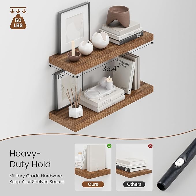 - Extra Deep Floating Shelves: Measuring 11.6” D x 35.4” W x 1.5” H, these shelves are crafted for maximum depth and durability. The spacious 12” depth gives you plenty of room for stylish display, organized storage, and decorative accents. Perfectly suited for your bathroom, kitchen, or living room, they enhance both function and flair in any space!