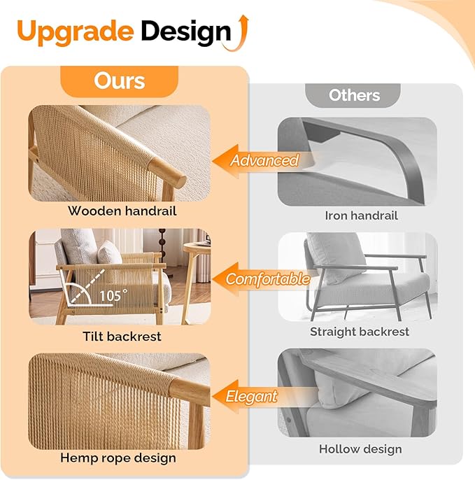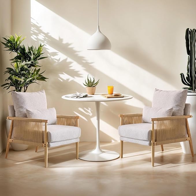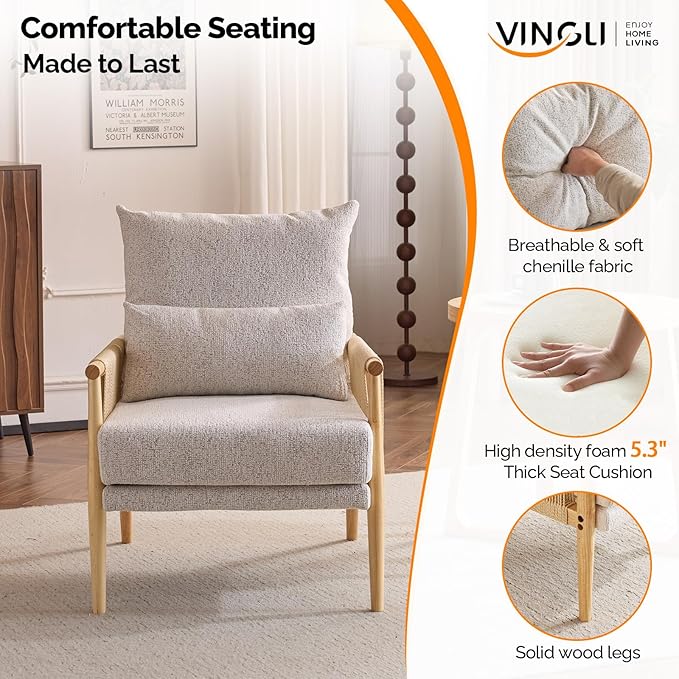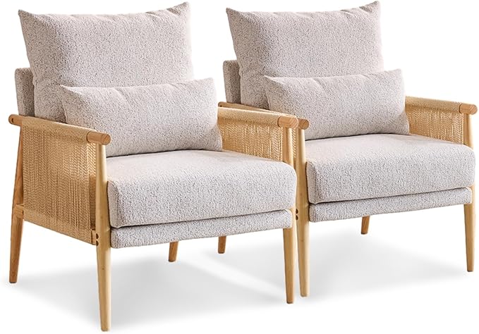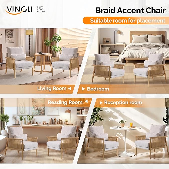 VINGLI Boho Braid Accent Armchairs Set of 2,Mid-Century Modern Chiars with Solid Wooden Armrest,Comfy Louge Cushion Chairs with Waist Pillow for Bedroom,Living Room,Reading Room, Light Grey