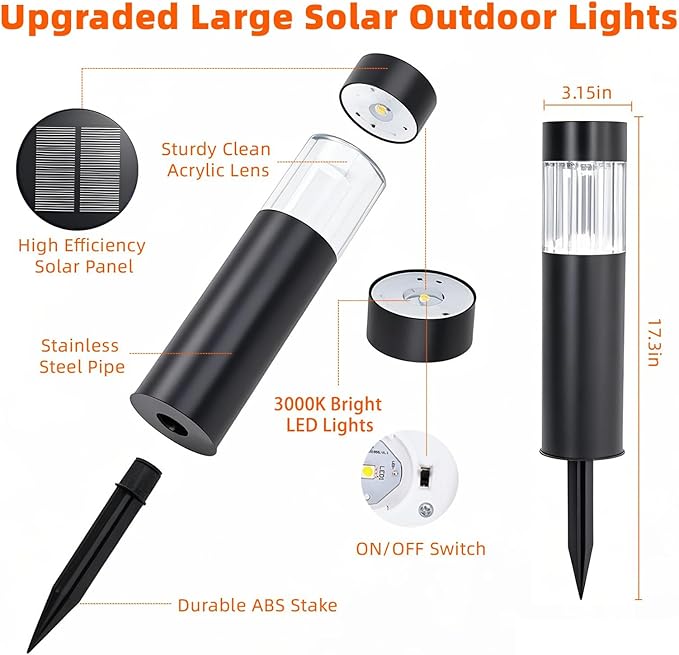 - 【DURABLE STAINLESS STEEL & ALL-WEATHER DESIGN】 – Crafted with rust-resistant stainless steel and IP65 waterproof protection, these solar lights withstand rain, snow, frost, and summer heat. Heavy-duty and maintenance-free, they deliver reliable lighting year-round and keep your outdoor décor shining.