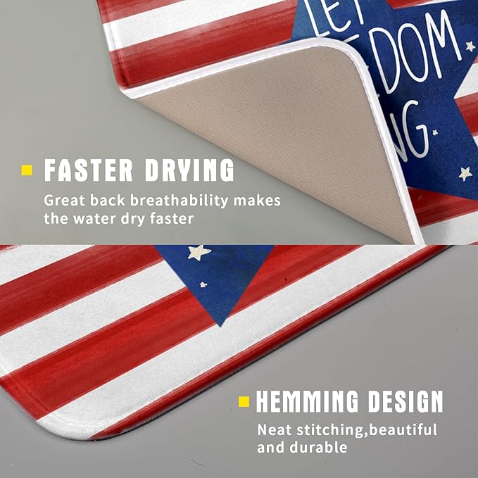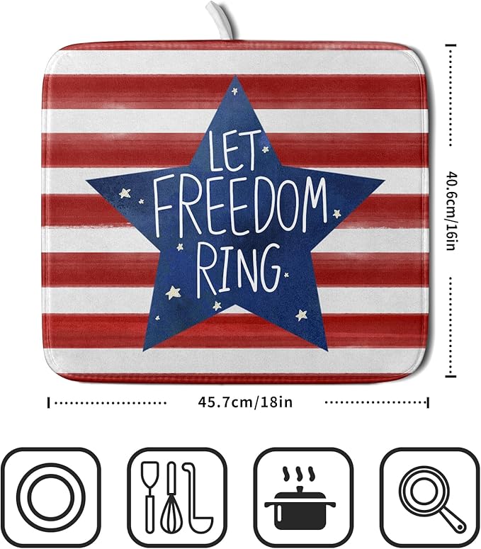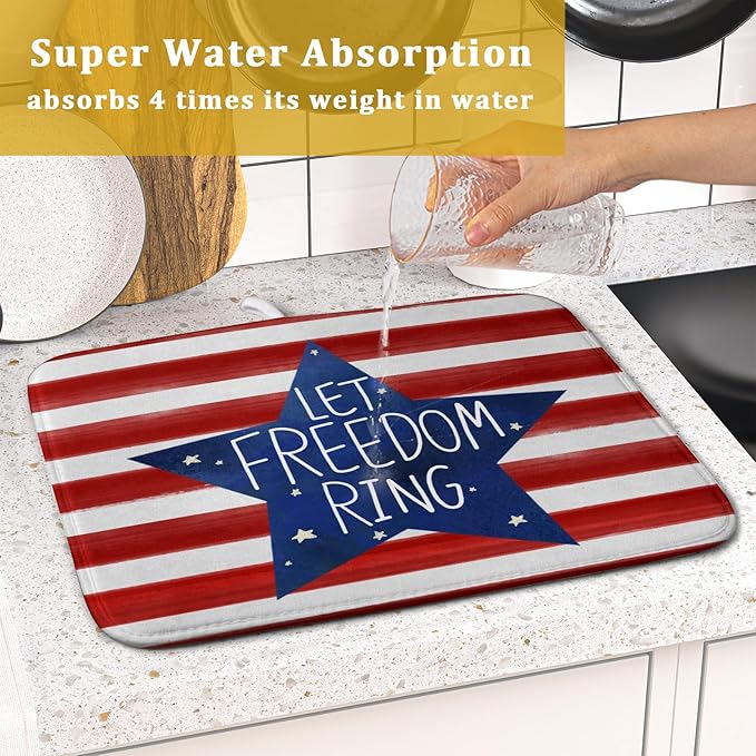 - 【Absorbent】The 4th of July dish drying mat is a 3-ply design made of absorbent microfiber, composite sponge, and cotton sateen fabric, the dish drying pad absorbs 4X its weight in water. Perfect for air-drying dishes, glasses, pots, pans, bottles, fruits, and vegetables