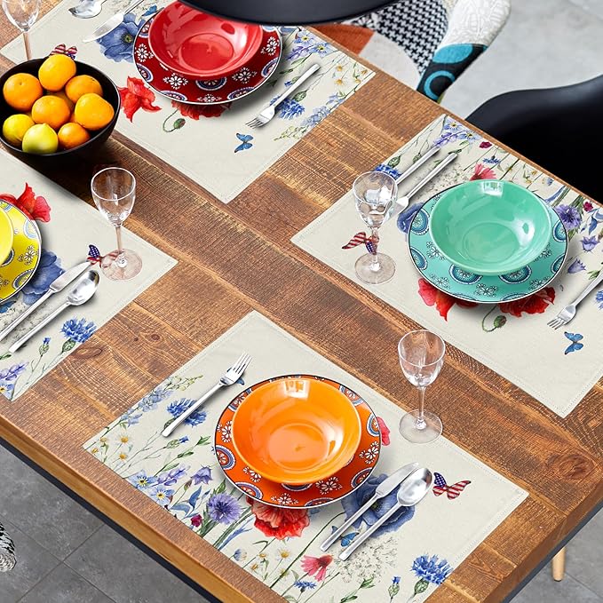 4th of July Placemats Set of 4 Red Blue Floral Patriotic Washable Non-Slip Heat Resistant Place Mats America Memorial Day Independence Day Table Mats 12x18 Inch