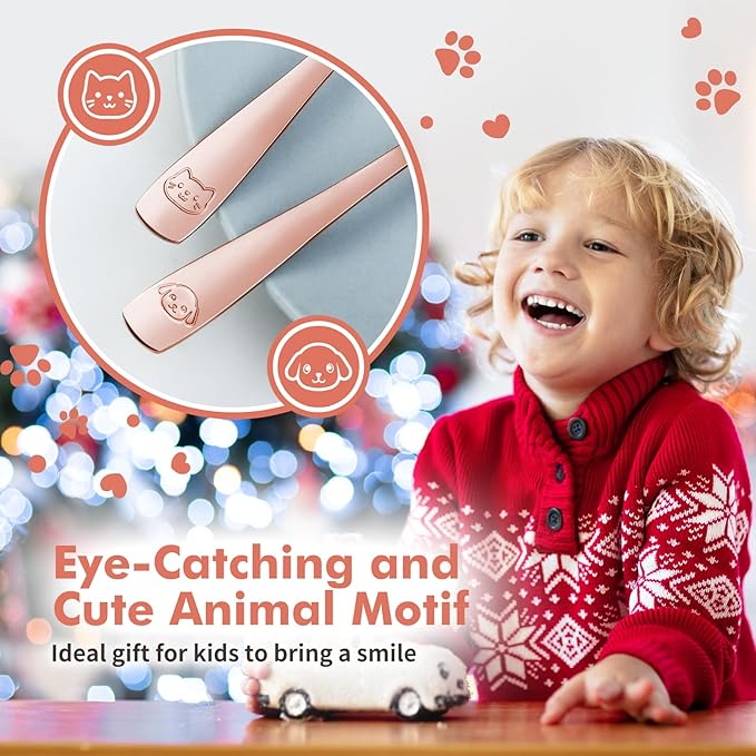 - ENGAGING MEALTIMES: Our kids silverware set embossed with a mirror-polished finish and adorable animal motifs. Your child will be excited to dine with a kitten on the spoon and a pup on the fork, turning mealtime into a fun and engaging experience