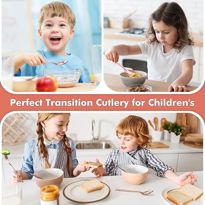 - IDEAL TRANSITIONAL CUTLERY: This set of 6 includes 3 kid forks and 3 kid spoons in rose gold. Ample quantity for daily needs by toddlers, kids, preschoolers, and school-age children, and allows for an easy transition to full-sized utensil