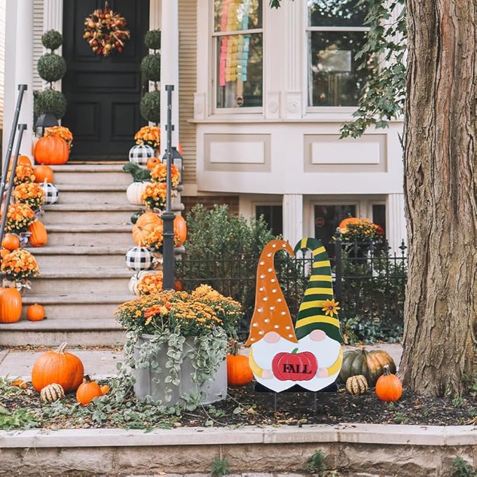 - 🍁【Versatile Outdoor Decor】Transform your outdoor spaces with the cozy charm of autumn! These whimsical fall gnome garden stakes effortlessly add a festive touch to any yard or patio. Perfect for lining walkways, accenting flower beds, or highlighting backyard nooks, their durable metal design withstands the elements while creating a warm, inviting atmosphere. Whether your style is rustic, modern, or cozy, these stakes bring autumn magic to every outdoor setting!