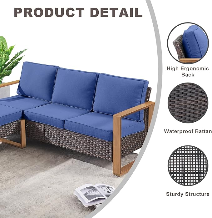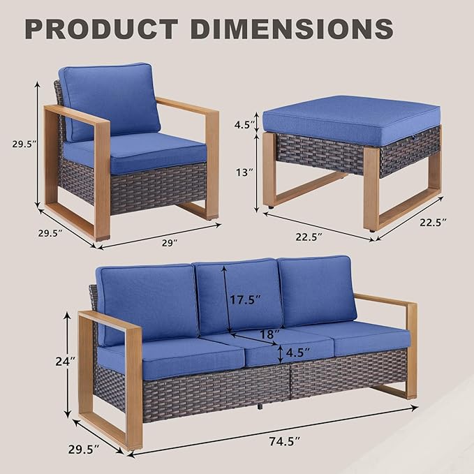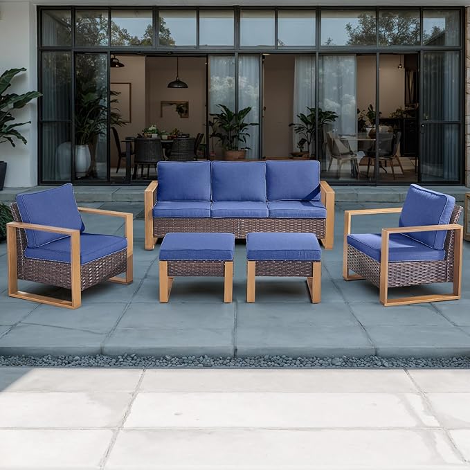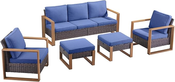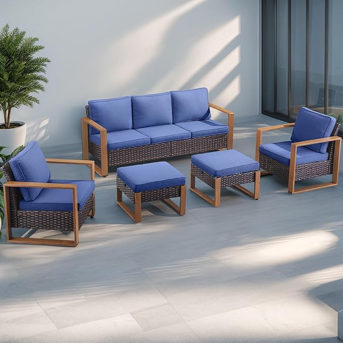 Outdoor Wicker Patio Furniture Set - 5 Piece Patio Conversation Set with 2 Wicker Armrest Chairs,2 Rattan Ottoman and 1 Couch,Sturdy Frame,Thick Cushions,Deep Seating(Brown/Blue)