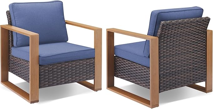 - Stylish Wood-Grain Finish:Elevate your outdoor space with our wicker patio furniture chairs set, featuring a stunning faux wood-grain armrest design that mimics the beauty of natural wood. This environmentally friendly choice not only enhances the ambiance of your garden but also requires minimal maintenance, reducing the demand for real wood. Paired with handcrafted wicker, these sets add a modern touch to any outdoor decor, providing a fresh and inviting look