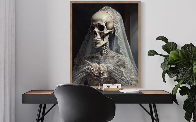 Skull Gown Poster Art Print, Halloween Scary Vintage Wall Art Academia Spooky Painting Decoration for Horror Prints, Gothic Posters Bedroom Decor 89 (Skull Gown, 11 x 14 inches, Wood Frame)