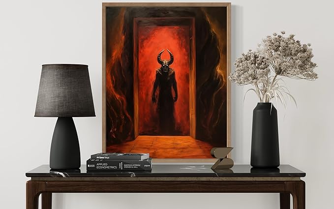 Satan and Hell Poster Art Print, Halloween Scary Vintage Wall Art Academia Spooky Painting Decoration for Horror Prints, Gothic Posters Bedroom Decor 89 (Satan and Hell, 8 x 10 inches, Wood Frame)