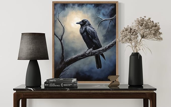 Crow under the Moonlight Poster Art Print, Halloween Scary Vintage Wall Art Academia Spooky Painting Decoration for Horror Prints, Gothic Posters Bedroom Decor 89 (Crow under the Moonlight, 16 x 20 inches, Wood Frame)