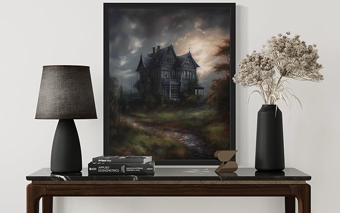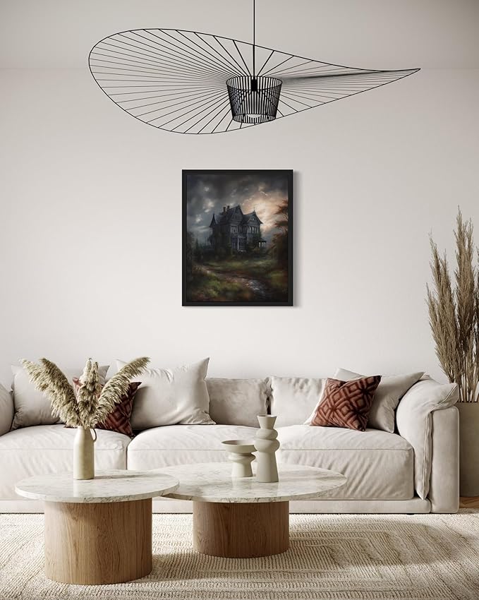 Haunted House Poster Art Print, Halloween Scary Vintage Wall Art Academia Spooky Painting Decoration for Horror Prints, Gothic Posters Bedroom Decor 89 (Haunted House, 16 x 20 inches, Black Frame)