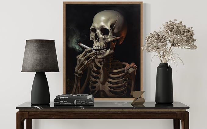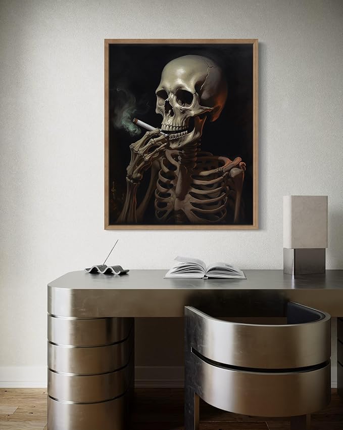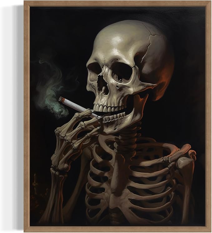 Skull Smoking Ciggarettes Poster Art Print, Halloween Scary Vintage Wall Art Academia Spooky Painting Decoration for Horror Prints, Gothic Posters Bedroom Decor 89 (Skull Smoking Ciggarettes, 16 x 20 inches, Wood Frame)