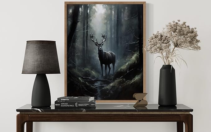 Deer in Forest Poster Art Print, Halloween Scary Vintage Wall Art Academia Spooky Painting Decoration for Horror Prints, Gothic Posters Bedroom Decor 89 (Deer in Forest, 16 x 20 inches, Wood Frame)