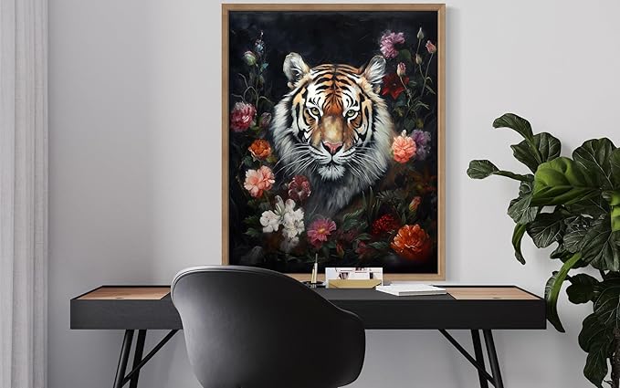 Tiger and Flower Poster Art Print, Halloween Scary Vintage Wall Art Academia Spooky Painting Decoration for Horror Prints, Gothic Posters Bedroom Decor 89 (Tiger and Flower, 11 x 14 inches, Wood Frame)
