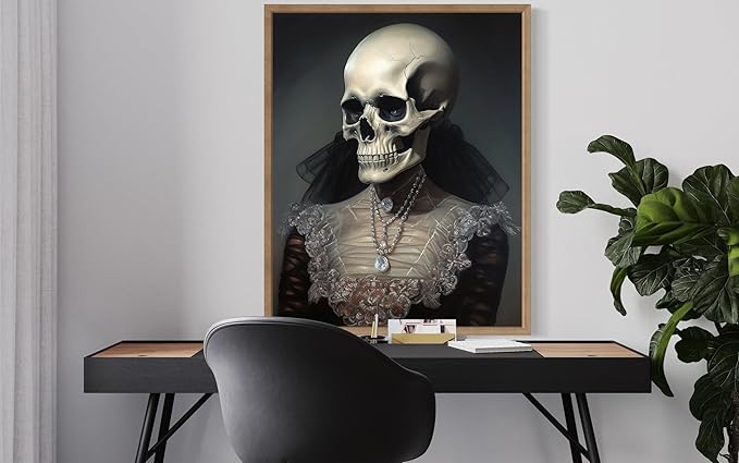 Female Skull Poster Art Print, Halloween Scary Vintage Wall Art Academia Spooky Painting Decoration for Horror Prints, Gothic Posters Bedroom Decor 89 (Female Skull, 16 x 20 inches, Wood Frame)